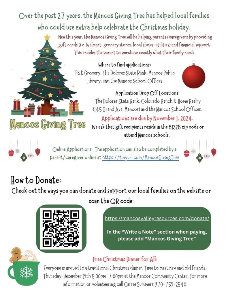 Applications for families or individuals are available at the P&D, Dolores State Bank, Mancos School offices and the Visitors Center kiosk at the corner of Main and Grand Avenues. Completed applications can be dropped at Dolores State Bank, Mancos Schools, the Artisans or mailed to Mancos Valley Resources at PO Box 204, Mancos, CO 81328. There is also a drop box outside of the MVR office at 101 Bauer Avenue.